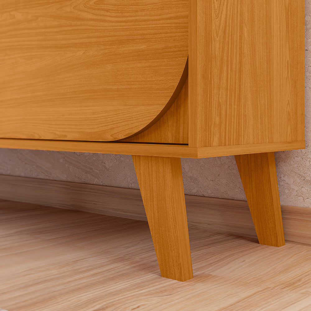 Com portas e painel que apresentam detalhes curvos, o combo cria uma composição harmônica e contemporânea. O acabamento refinado e as linhas suaves transformam o espaço em um ambiente acolhedor e elegante.