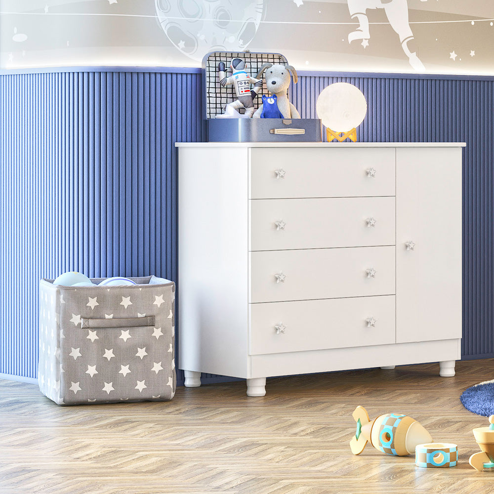 Com quatro gavetas espaçosas e uma porta lateral com prateleiras internas, a cômoda garante praticidade e excelente aproveitamento de espaço. Ideal para organizar roupas, calçados e itens do bebê, deixando tudo sempre ao alcance.