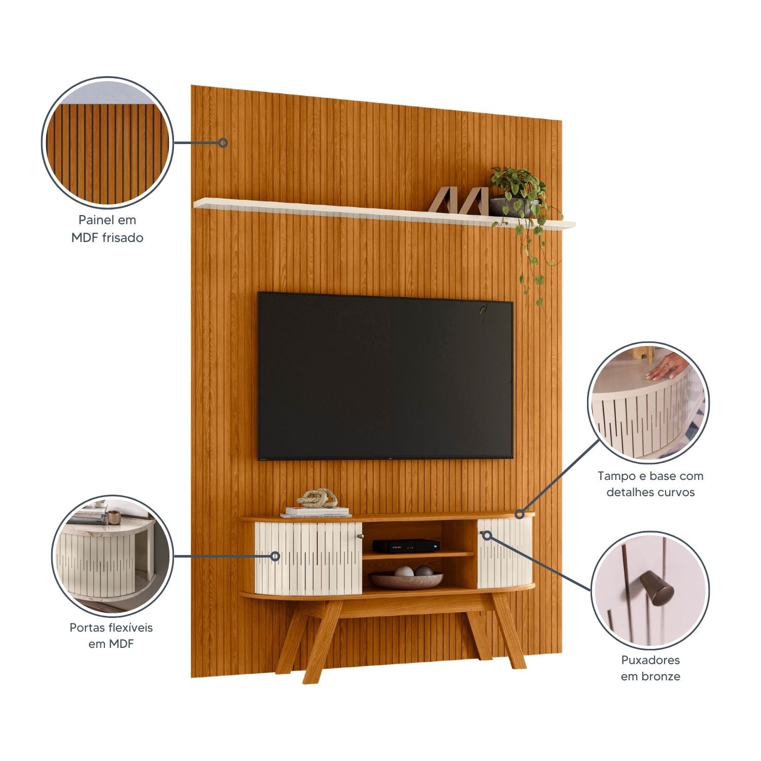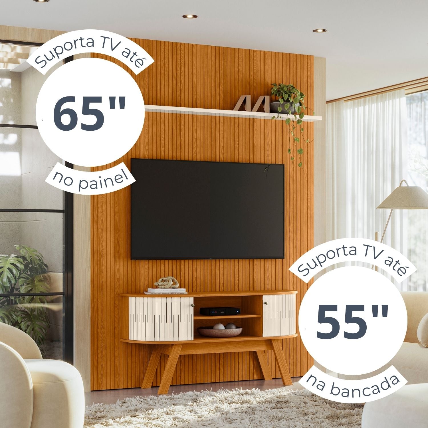 Produzida com chapas de MDP e MDF de 12, 15 e 25 mm e pintura UV de alta qualidade, a composição oferece resistência e longa vida útil. O conjunto é ideal para TVs de até 65 polegadas no painel e 55 polegadas na bancada.