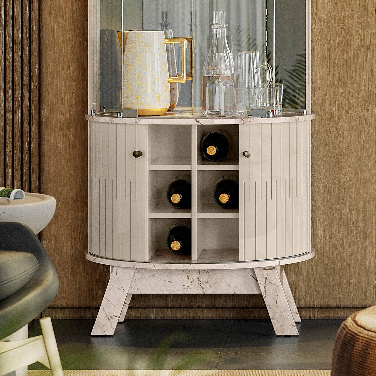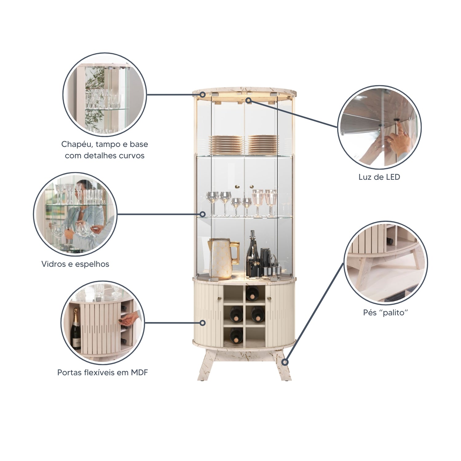 Com quatro portas de vidro deslizantes, seis nichos internos e duas prateleiras em vidro, o móvel oferece excelente espaço para organização e exposição. A iluminação em LED e os espelhos internos criam um efeito visual refinado, ideal para taças, cristais e decorações especiais.