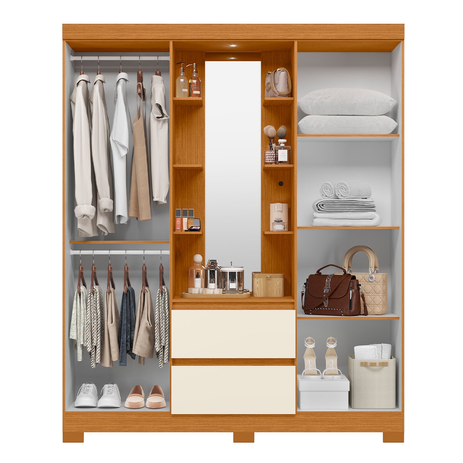 O interior do guarda-roupa é pensado para máxima organização, com divisões amplas, prateleiras resistentes e cabideiros de alumínio, permitindo armazenar roupas, acessórios e calçados com total praticidade.