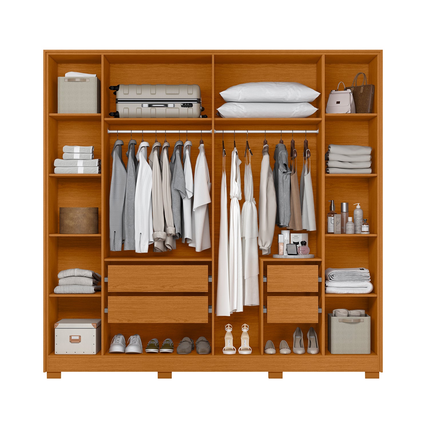 Com excelente divisão interna, o Guarda-Roupa Deville possui prateleiras amplas, cabideiros metálicos e nichos bem distribuídos, proporcionando organização perfeita para roupas, calçados e acessórios.