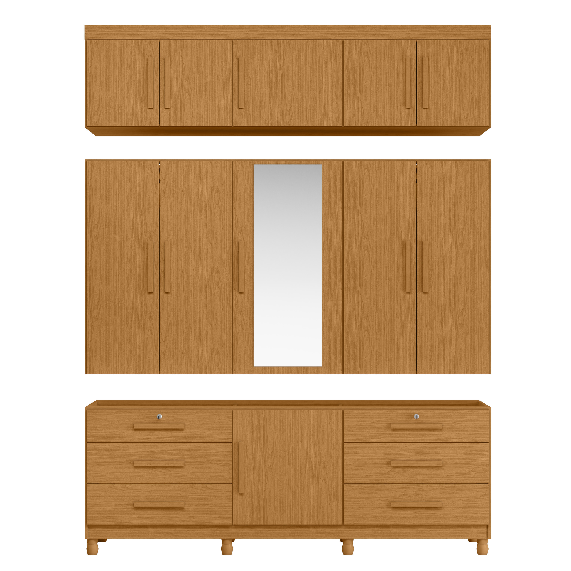 O modelo conta com 6 portas e várias prateleiras internas, além de cabideiros metálicos e gavetas espaçosas com corrediças telescópicas que garantem deslizamento suave e durabilidade. Ideal para casais que valorizam funcionalidade e conforto.