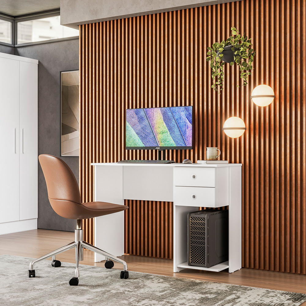 Com acabamento refinado em pintura UV e estrutura em MDP 15/12 mm, a escrivaninha garante resistência e durabilidade. Os puxadores plásticos tipo coleira proporcionam um toque moderno e confortável, enquanto as linhas retas e discretas se adaptam a diferentes estilos de decoração.