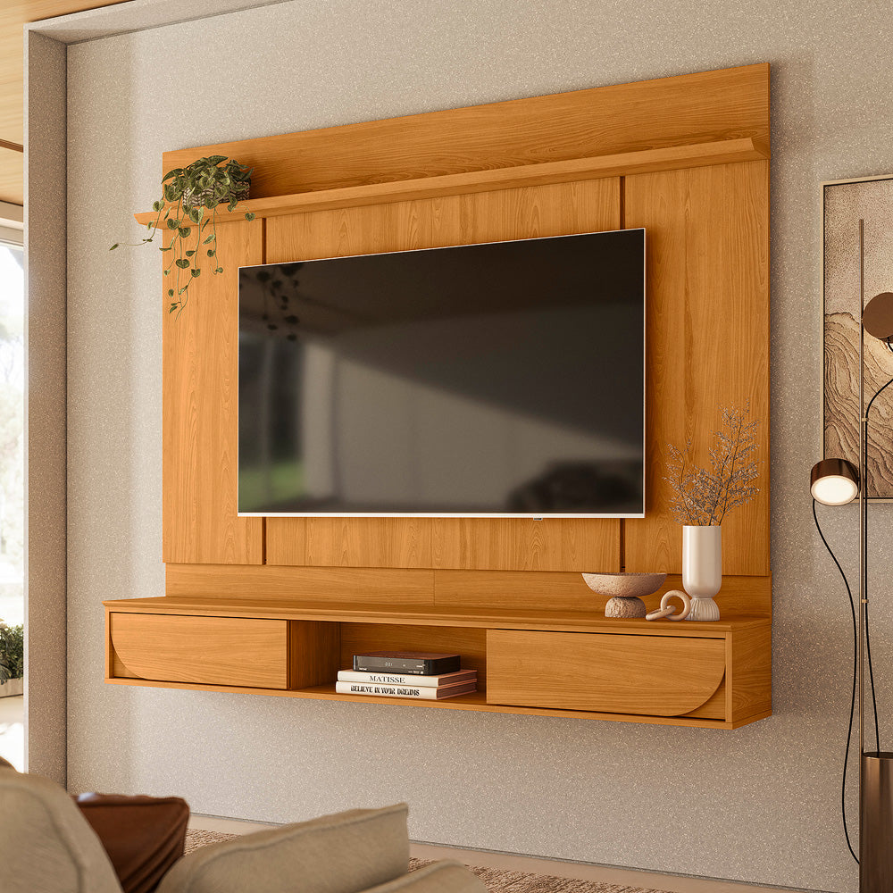 Produzido em MDP de 15 e 25 mm com pintura UV, o painel oferece resistência e longa vida útil. Suporta televisores de até 65" e peso total de 43 kg, garantindo segurança e estabilidade na instalação.