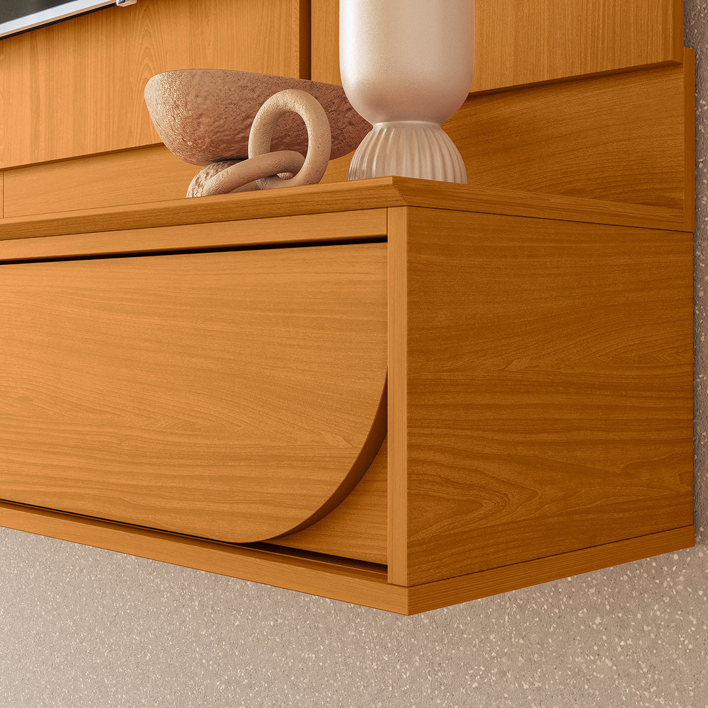 Projetado para fixação direta na parede, o painel mantém o ambiente leve e organizado. As portas deslizantes facilitam o acesso aos compartimentos internos, ideais para acomodar eletrônicos e acessórios com praticidade.