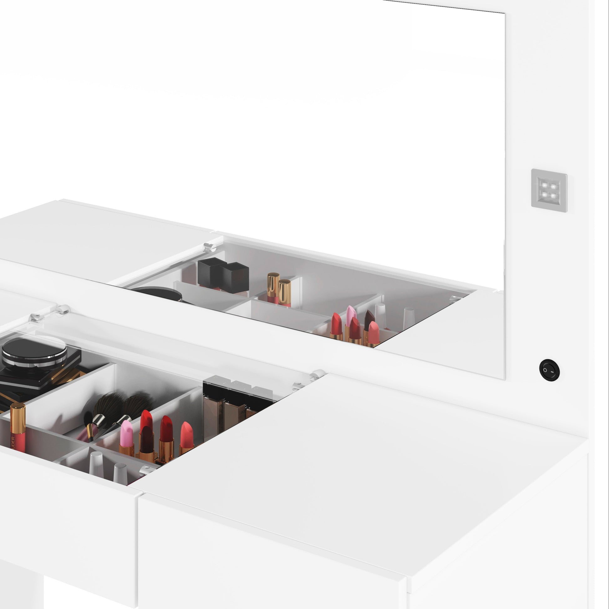 Equipada com gavetas amplas e bem distribuídas, a bancada oferece praticidade para armazenar maquiagens, acessórios e itens pessoais. Tudo isso com corrediças metálicas de alta qualidade, garantindo suavidade e durabilidade no uso diário.